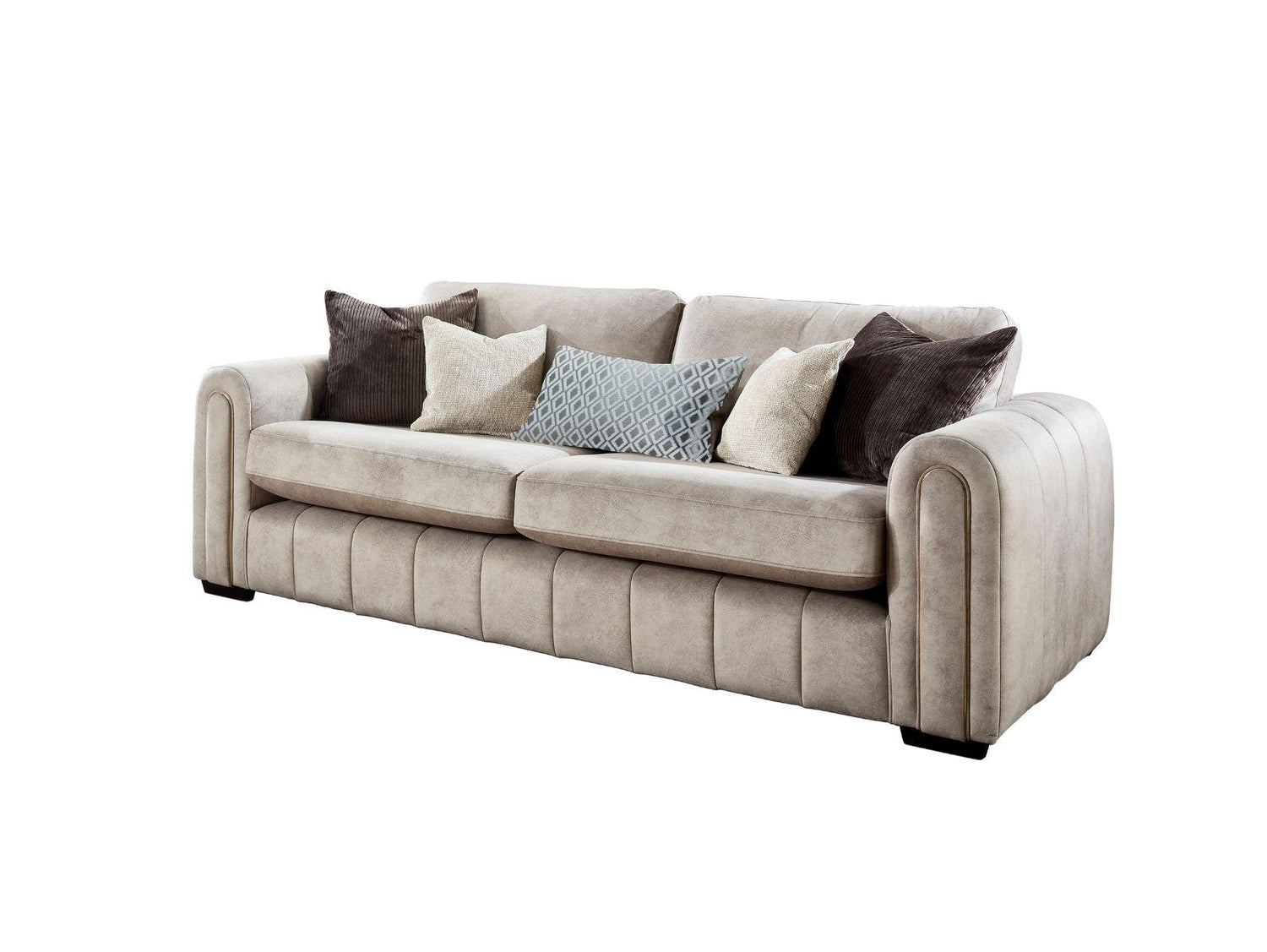 Upholstered in the premium Stone Collection fabric, this sofa brings soft texture and timeless appeal to any room. The refined gold piping adds a touch of luxury, while the mahogany-effect feet introduce warmth and classic charm to the overall design.