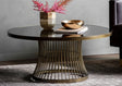 The Rushford Coffee Table is truly a stunning piece of craftsmanship—a perfect addition to any home that seamlessly blends stylish elements with practicality. The aged bronze powder-coated frame, fashioned in an eye-catching cage design, creates a captivating visual impact.