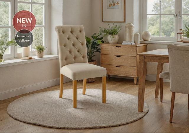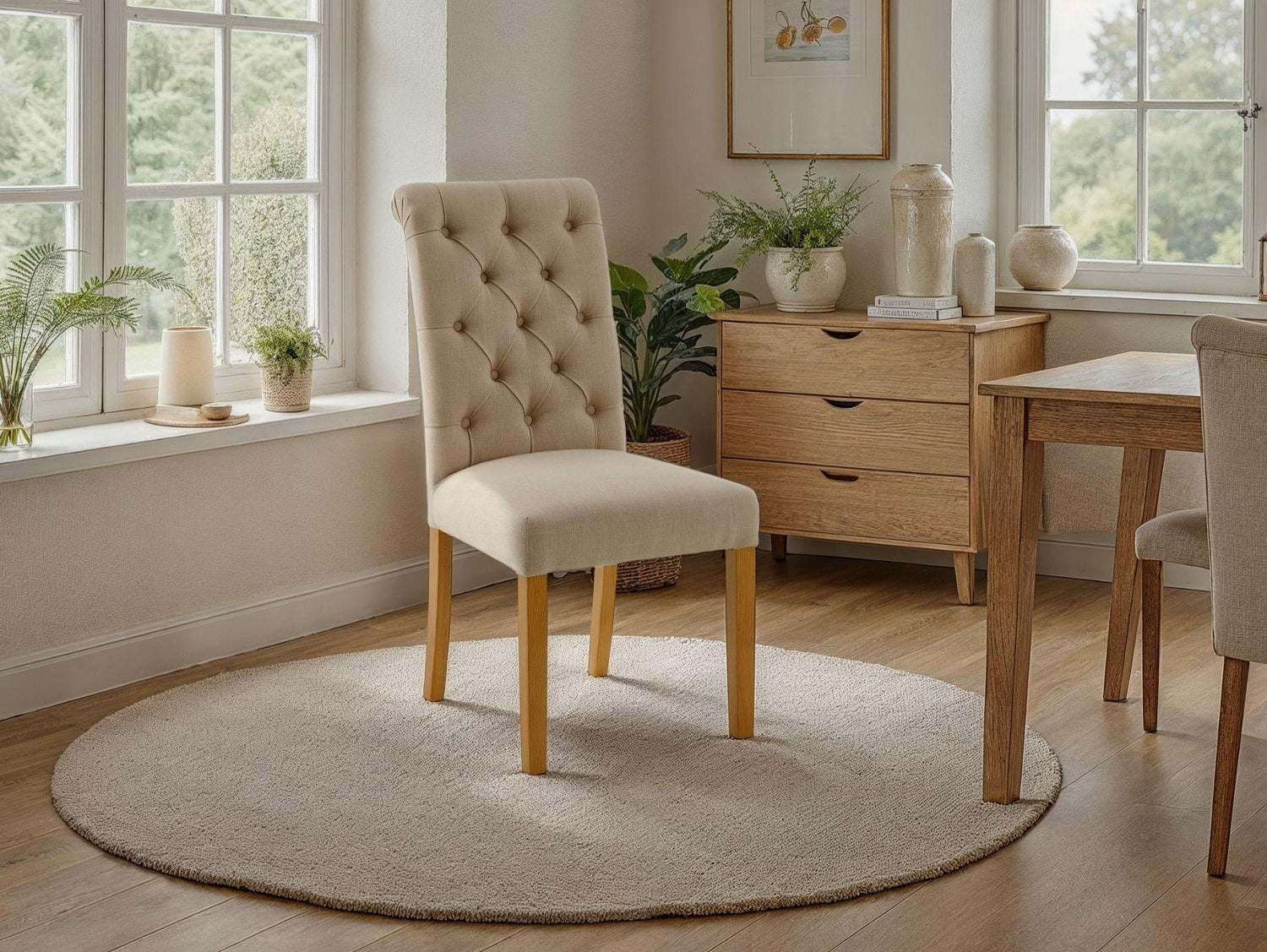 Add timeless appeal to your dining room with our Cambridge Dining Chairs, sold as a set of two. With an upholstered, supportive seat and back in natural-toned linen fabric, as well as natural oak legs, this chair's design ensures that you don't have to sacrifice comfort for classic appeal.