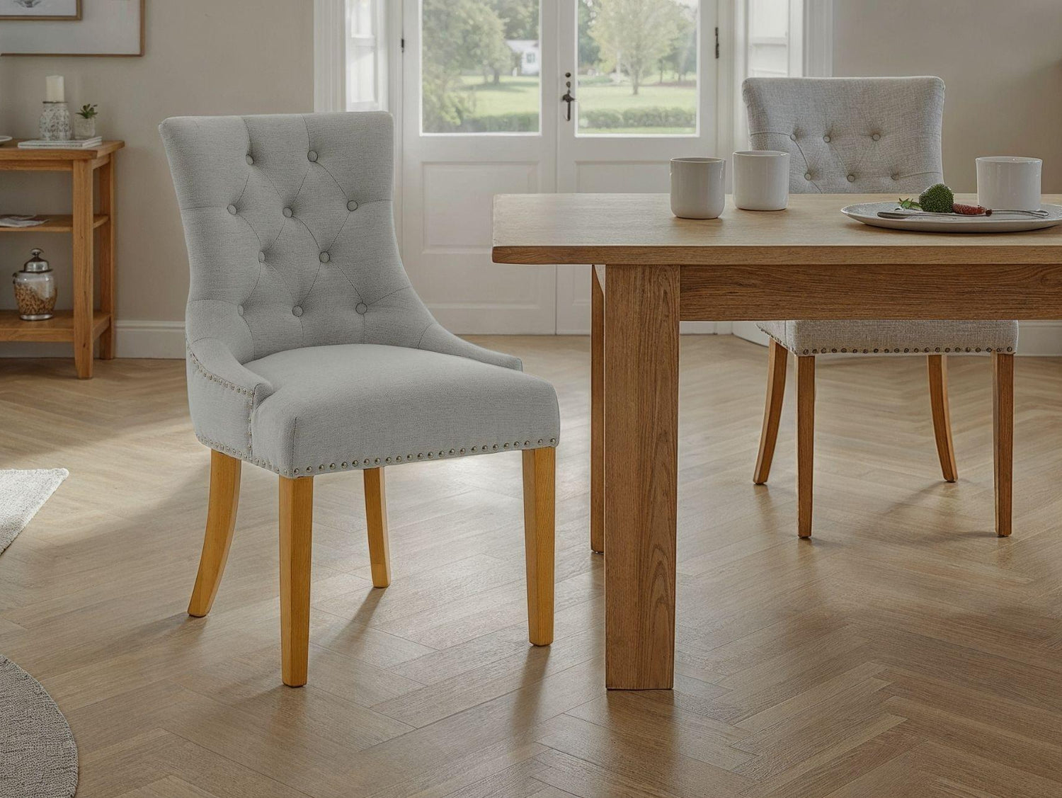 Elegant in their upholstered design, our Cotswold Dining Chairs are ready to complete your dining space with refined appeal. Crafted with natural, solid oak legs and a sprung seats with pearl-grey linen fabric, modern ease combines with classic style for these distinguished dining chairs.