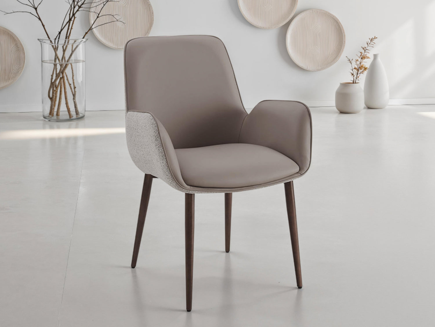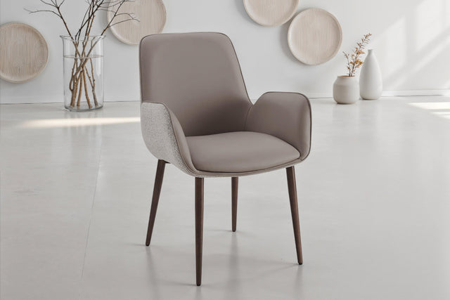 Designed for comfort and style, the Denali Dining Chair in Mocha pairs perfectly with the Denali Extendable Dining Table or any modern dining table and chairs set. Upholstered in contrasting fabric and PU leather, this chair offers supportive seating with a designer look. Its soft cushioning and stylish silhouette make it a standout piece in any kitchen table and chairs or dining room table setup.