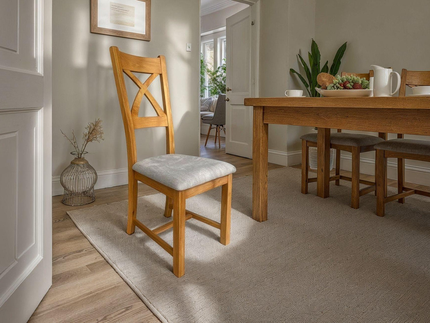 Our Somerset Dining Chairs are ideal for those who value classic design at an affordable price. The natural oak structure provides a well-rounded, organic appeal, with their wooden backs featuring a cross design reminiscent of cottage living, perfect for those who enjoy a cosy dining area. Enjoy upholstered, padded seats in grey fabric, whilst non-slide pads on the bottom of the chairs make scuffing a problem of the past.