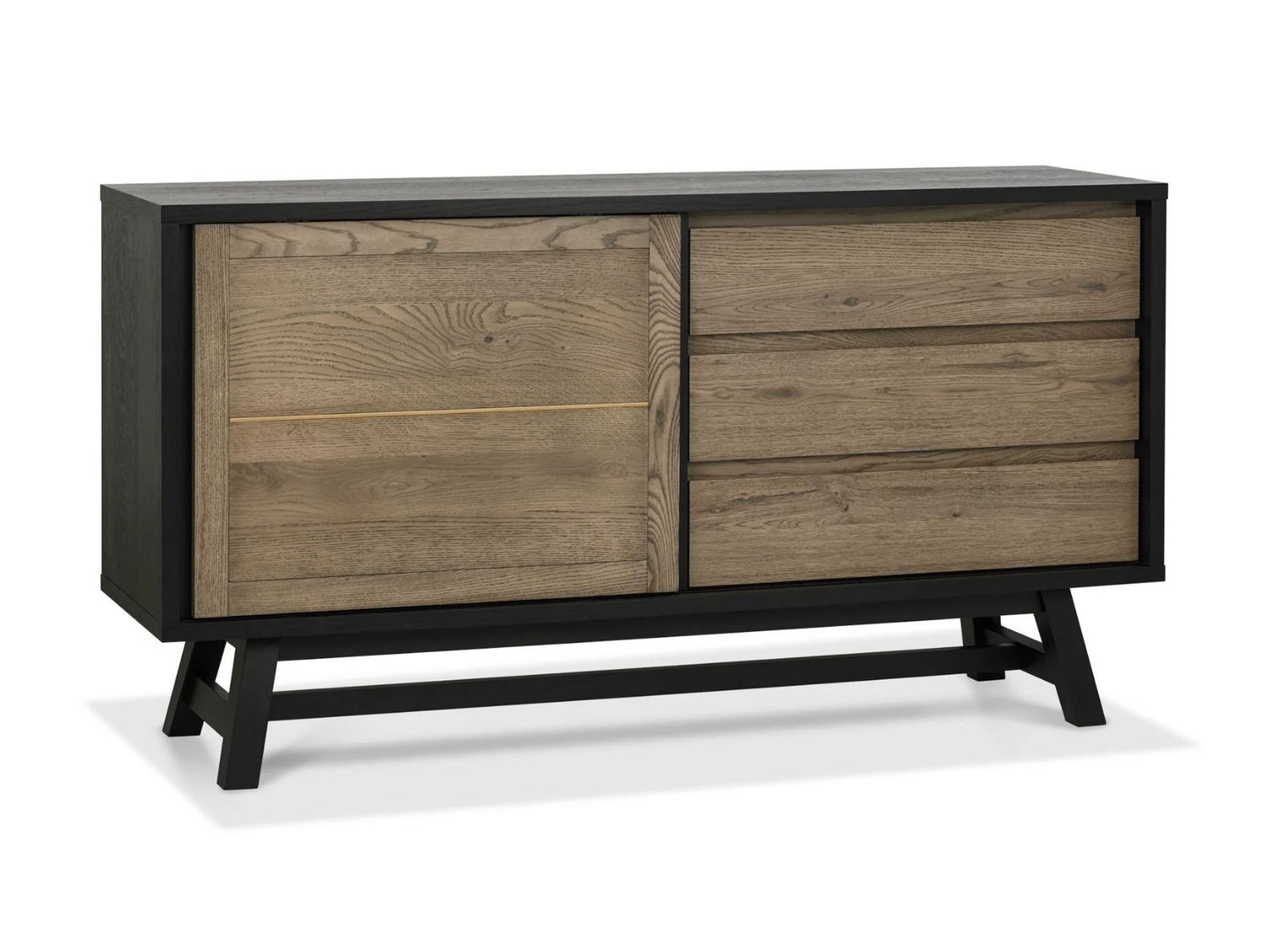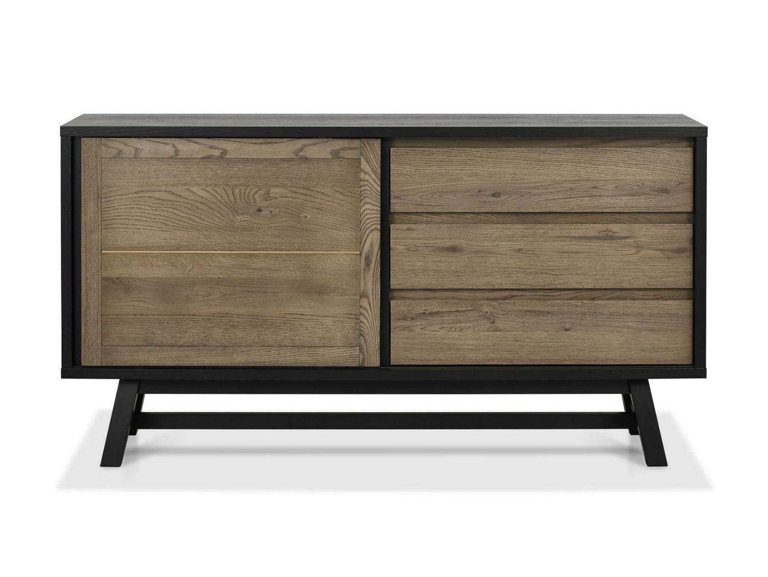 The Candice Oak Sideboard presents an eye-catching combination of design elements, featuring solid framed oak veneer panel table tops and cabinet facias in a weathered finish adorned with striking solid brass inlays. These remarkable details are complemented by the "peppercorn" finished solid ash "A" frame legs and wire-brushed oak veneered surrounds, resulting in a collection that exudes a distinct contemporary edge.