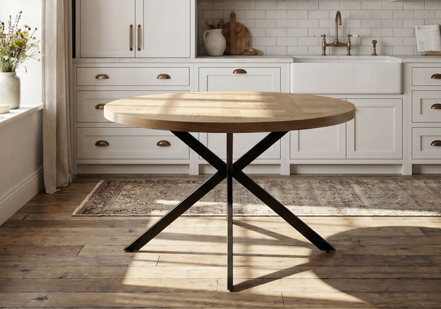 Ideally suited to modern and classic interiors alike, the Carlton Dining Table boasts angular black legs for an industrial touch, complemented by its round oak-veneer tabletop in a basket weave-inspired pattern. With a round silhouette, this dining table subtly encourages connection with face-to-face dining, perfect for small families or hosting a friend or two.
