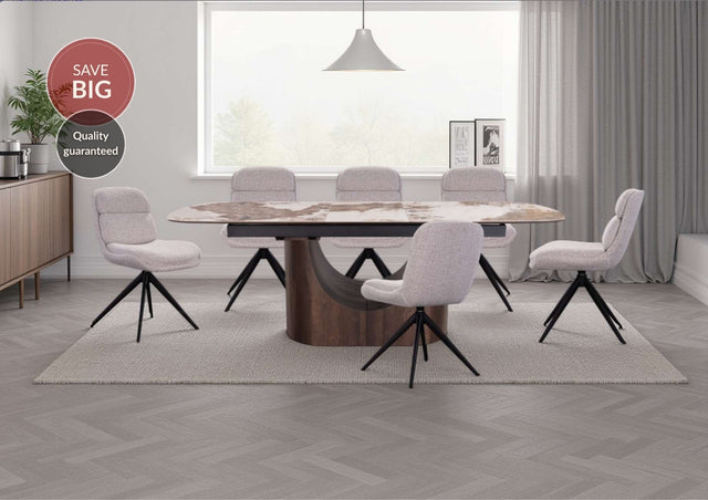 Complete your dining space with the Solar Extending Dining Table and Dining Chairs. Able to host up to six people while closed - or eight to ten when opened - this table is the perfect fit for family and friends. The rich, brown marble effect of the table-top gives your dining area a luxe finish, with a shapely wooden base aiding in creating a sleek, modern silhouette.