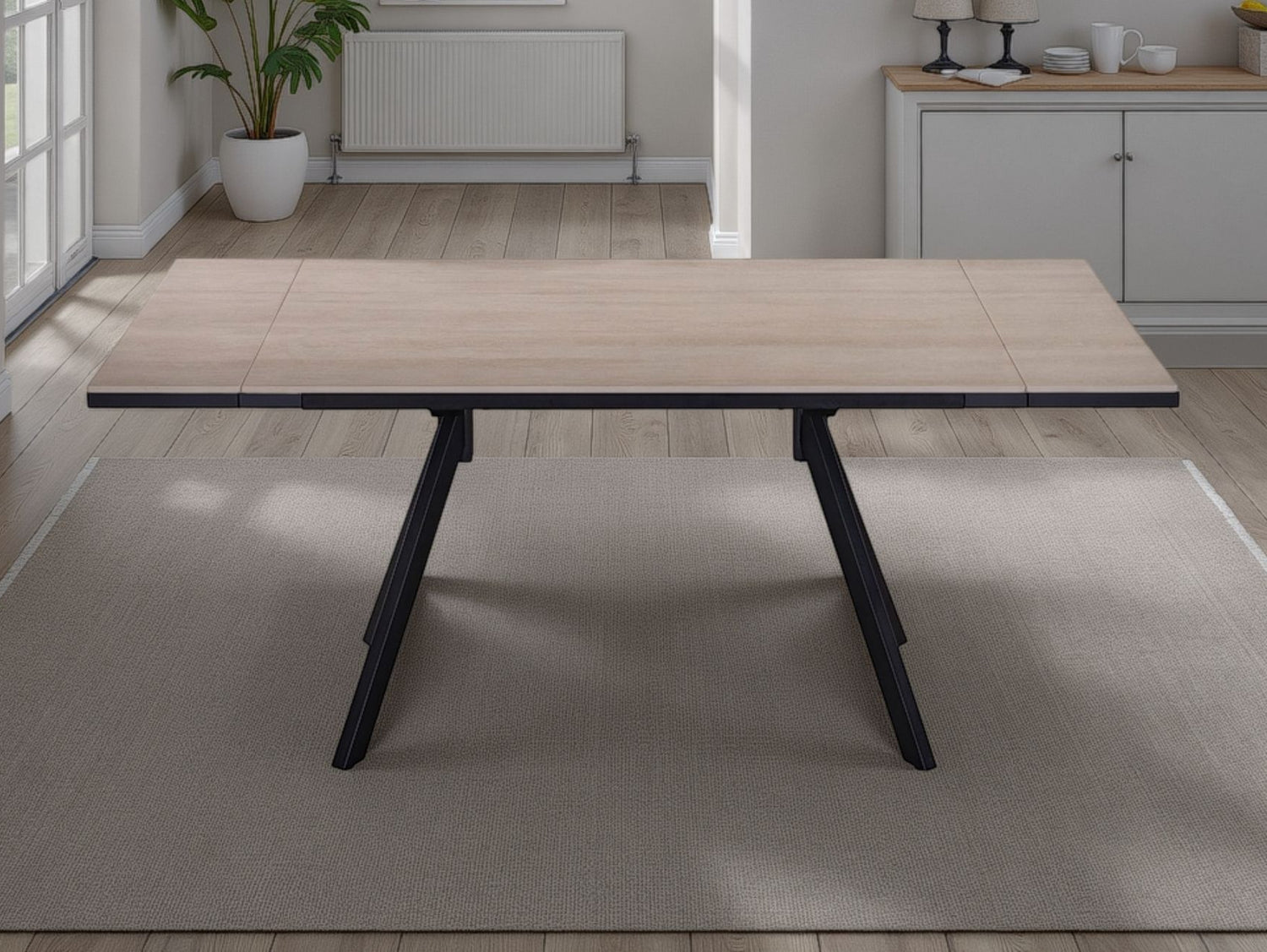 Deceptively simple in appearance, the Vertigo Extending Dining Table has been crafted to prize practicality in its contemporary design. The light-toned wood grain tabletop paired with the contrast of the black table legs creates a pleasant visual for anyone's dining room. Suited to families of various ages and size, the Vertigo Extending Dining Table does just what it says on the proverbial tin, seating up to six when condensed or between eight to ten when extended.