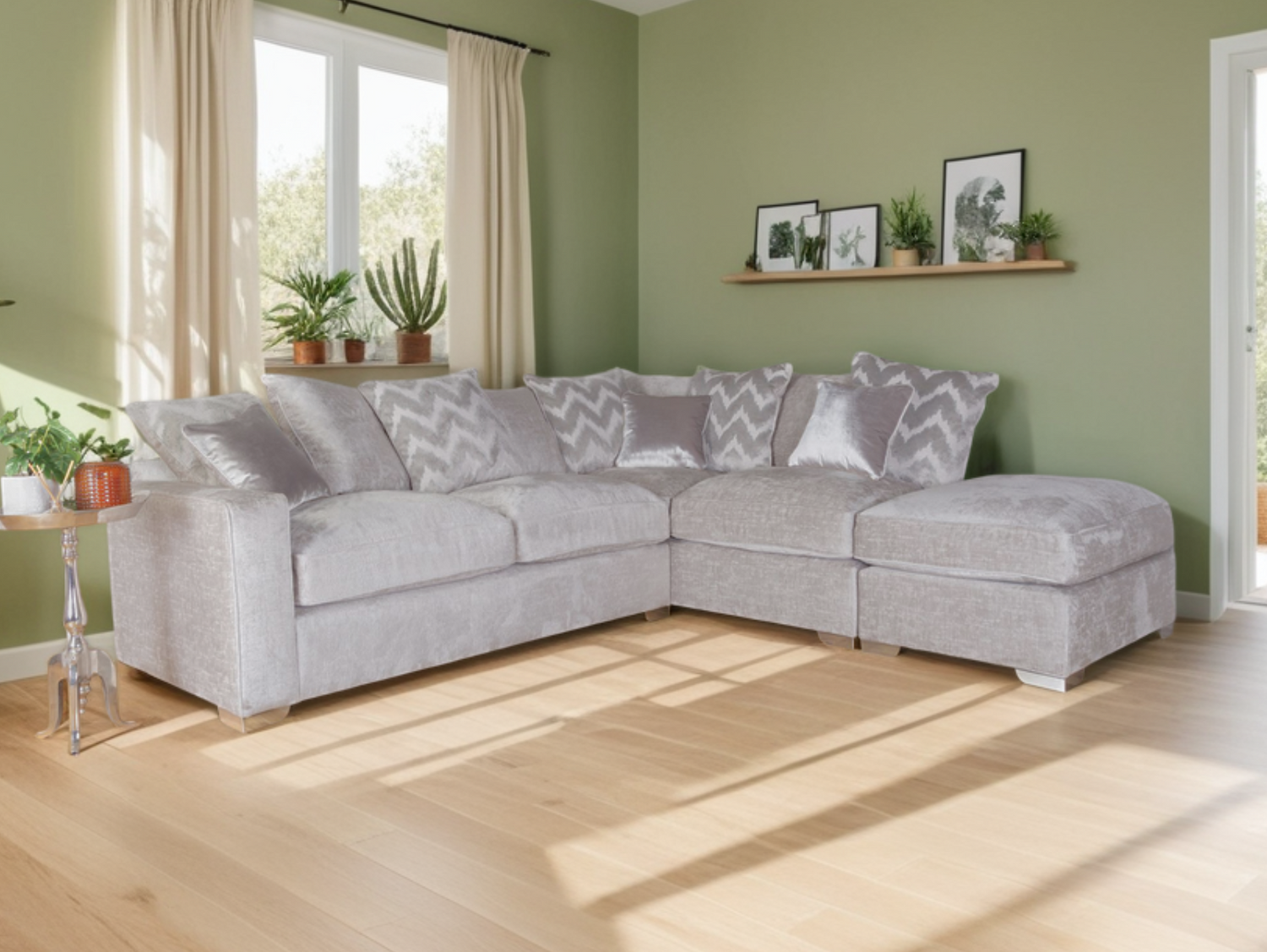 Introducing the exquisite Sahara Pillow Back - Left-hand 2 Seater with Right-hand Chaise and Footstool. Embrace the epitome of luxury with the Aaron Silver Collection, boasting a luscious silver upholstery that caresses with a luxurious soft touch.