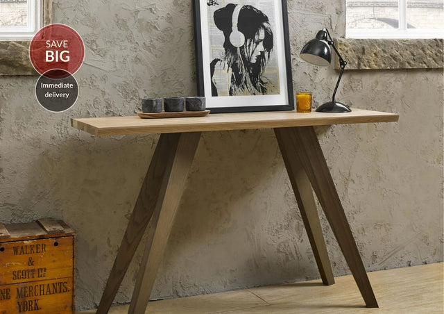 The table's design is further accentuated by the weathered oak detailing on the long, finely tapered legs, providing a beautiful contrast with the aged oak top. This combination of modern design elements and sleek style makes the Camborne Console Table a versatile and attractive piece that can be placed in various areas of your home, including the living room, hallways, or bedroom.