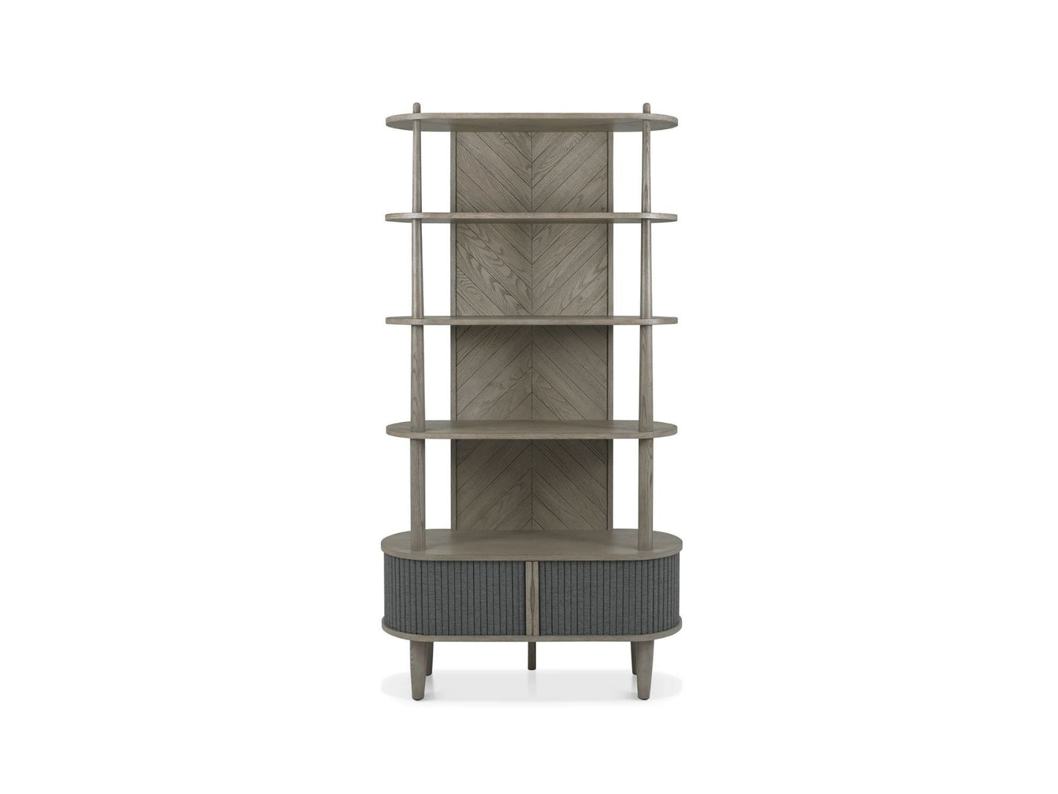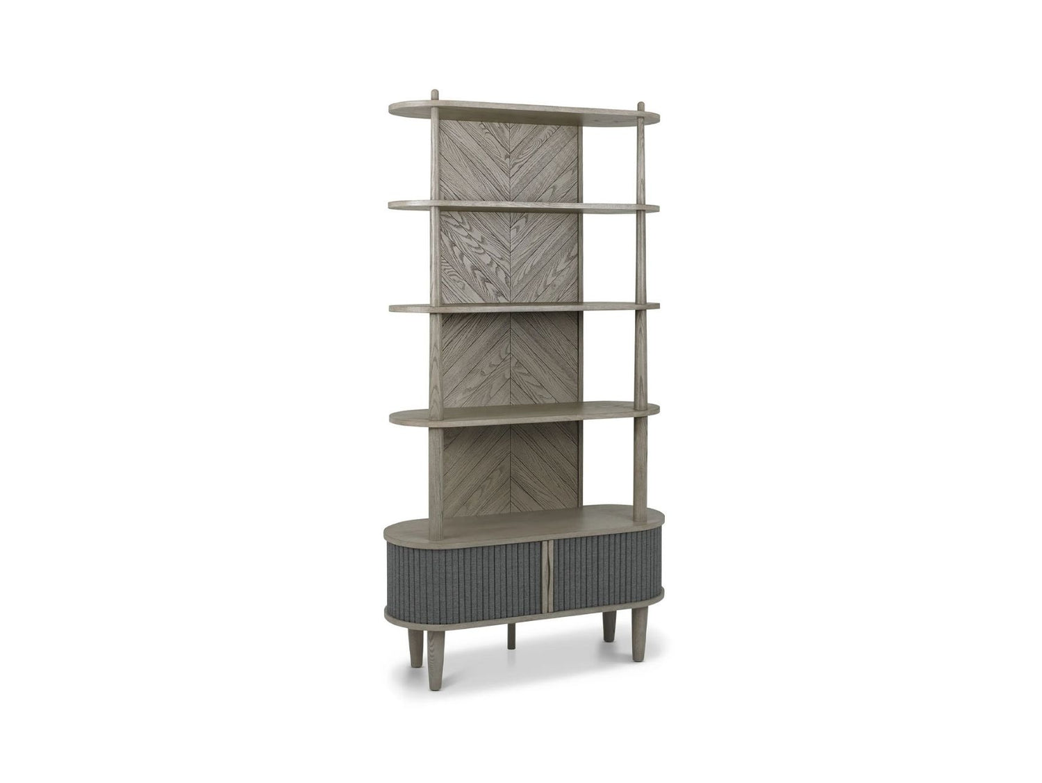 Tambour doors introduce texture and visual interest to the open display unit, while quality details such as soft-closing runners underscore the craftsmanship and refinement characteristic of the Marilyn collection.