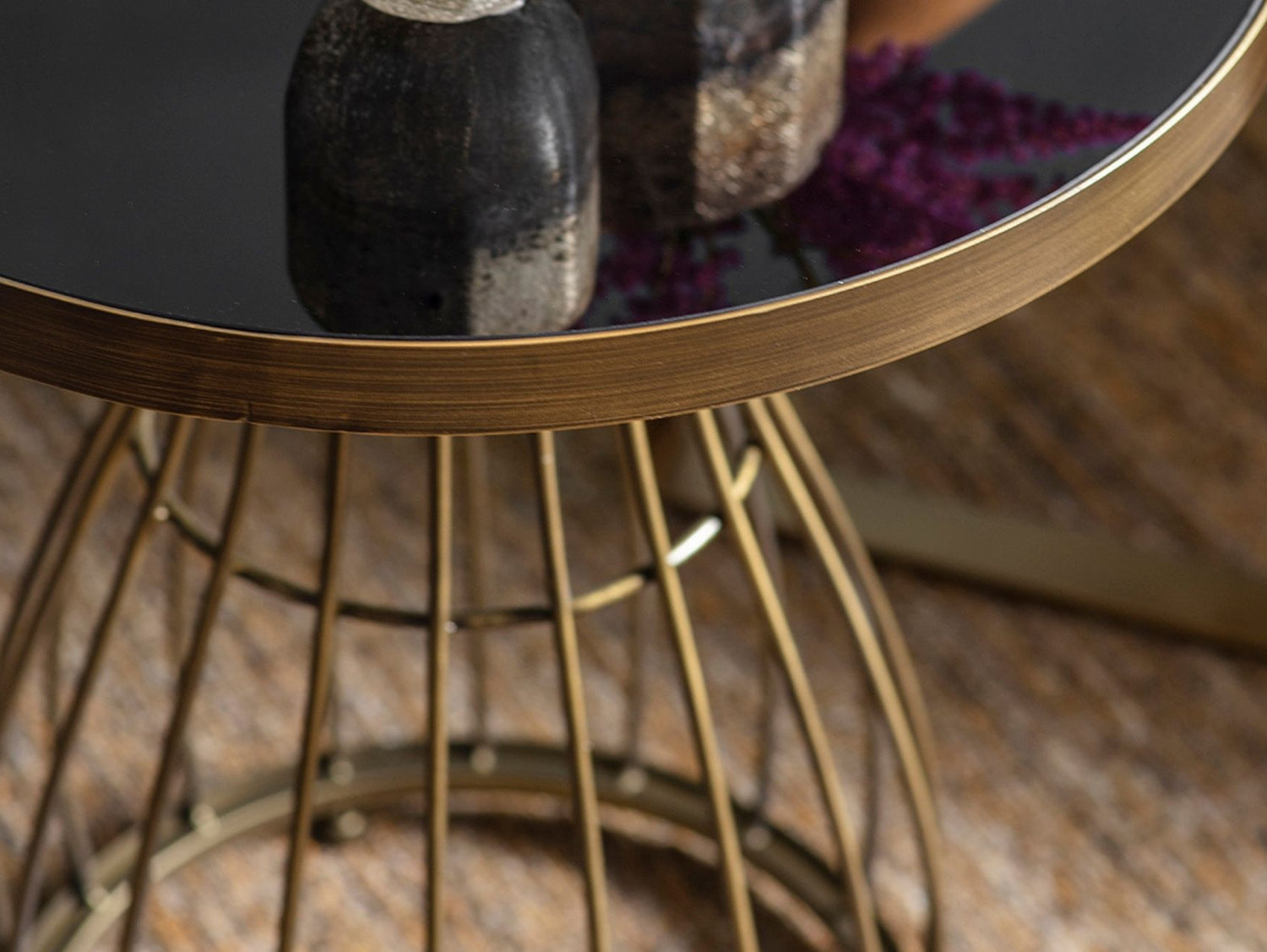 Finished in an aged bronze powder coating, the table gains character, harmoniously offset by the sleek modern tinted glass top. This lamp table is not just a functional piece; it's a work of art that adds a touch of modern sophistication to your living space, making a statement of style and design.
