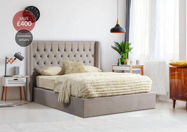 Meet the Faro Ottoman Bed Frame, a stunning addition that will elevate your bedroom decor to new heights. Handcrafted with meticulous attention to detail, this ottoman bed frame boasts a high winged buttoned headboard and an elegant design that exudes style and sophistication.