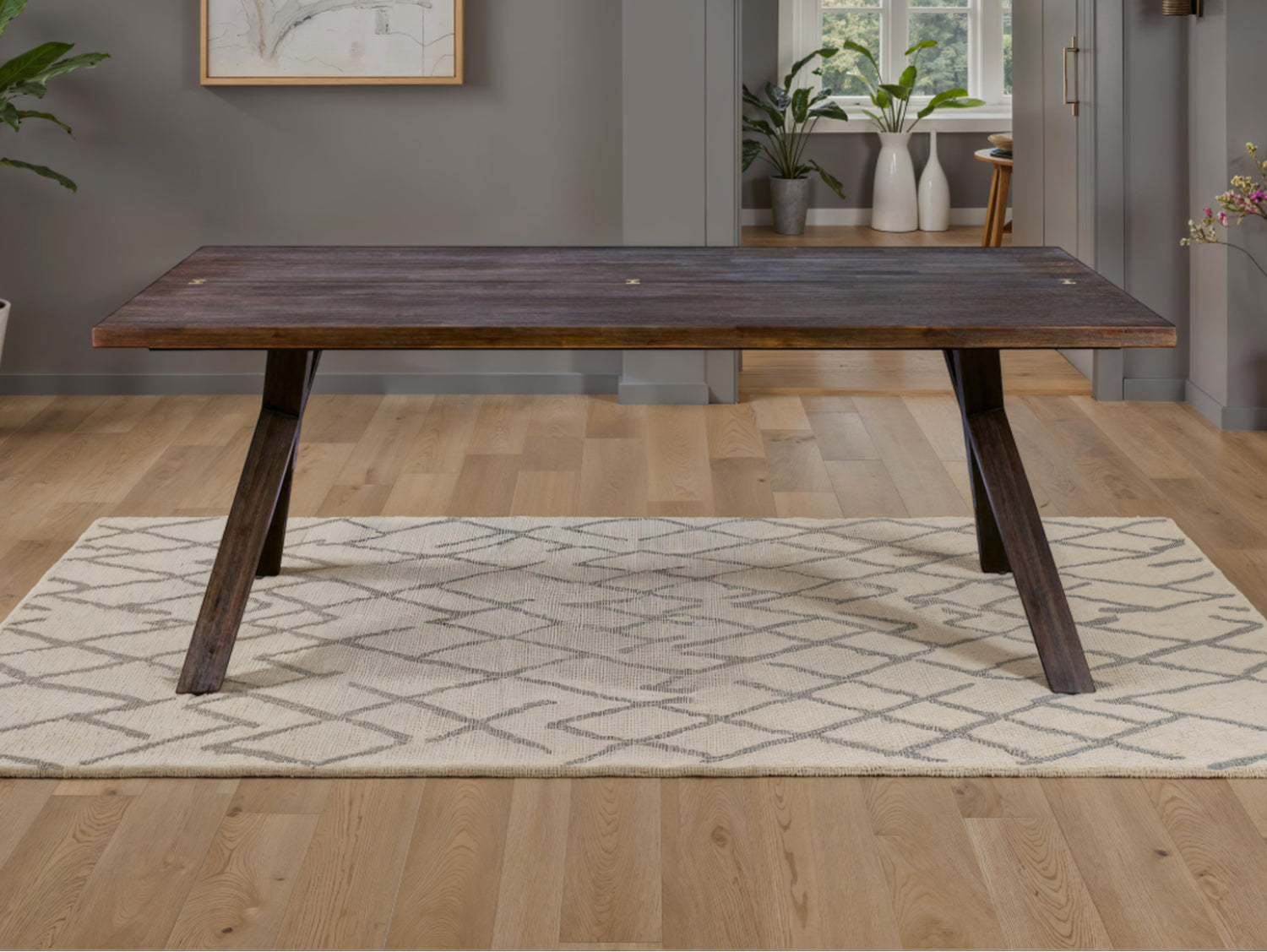 The Embla Dining Table is the centerpiece of the collection, made from 100% solid Acacia wood with a rich espresso finish and stunning brass butterfly inserts, showcasing both durability and sophistication.