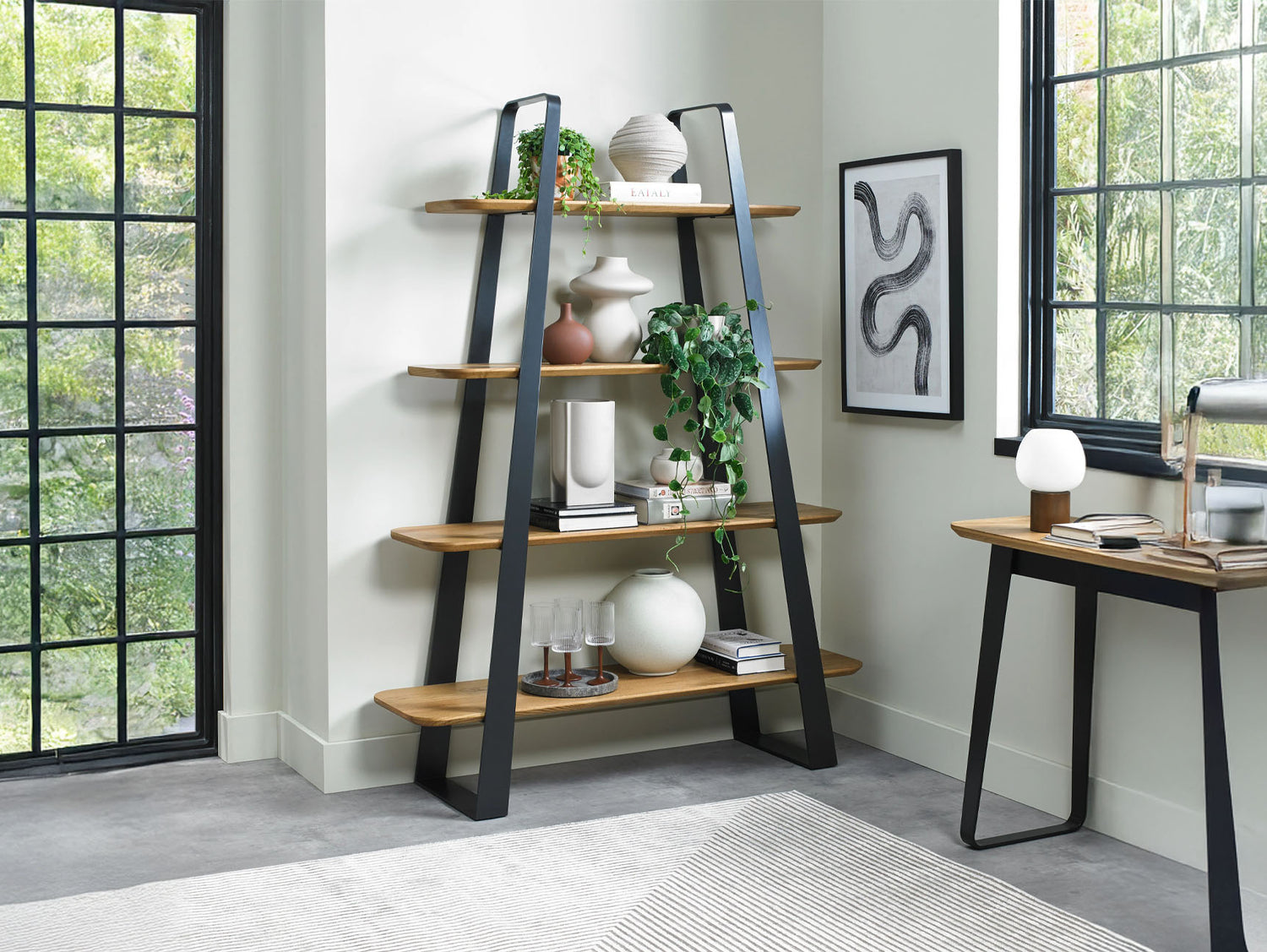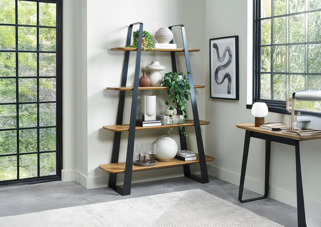 Elevate the display of your cherished items with the exquisitely crafted open display unit featuring handcrafted tapered shelf sizes with rounded edges. The modern welded black metal powder-coated frame enhances the rich colour of the wood, creating a striking visual contrast.