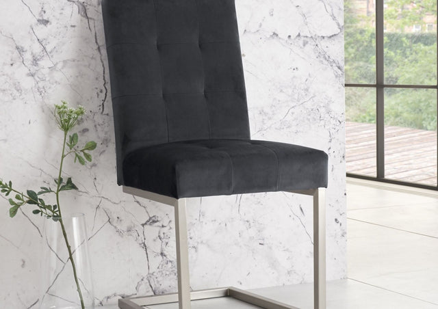 Designed for both style and comfort, the dining chairs boast a high backrest with quilted button detailing on the inside, creating an elegant and luxurious look. The upholstery is done in a durable gunmetal fabric, and there's a convenient polished silver handle on the back of the dining chair, adding a touch of refinement to the overall design.