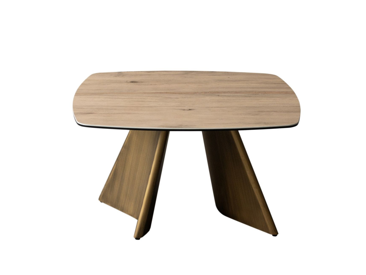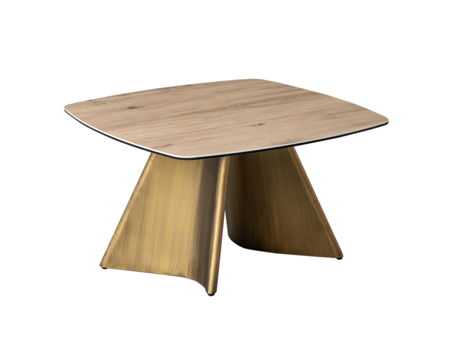 Crafted with a B3 brushed gold metal base and topped with 3mm ceramic wood veneer and 6mm glass, this side table offers the height of modern appeal. Minimalist in design, this piece is built to suit contemporary living, and can be dressed up or down for any occasion.
